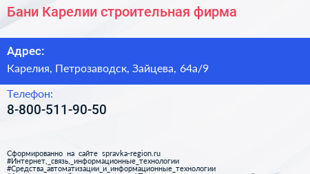 Бани Карелии, строительная фирма по адресу Карелия, Петрозаводск, Зайцева, 64а/9 в дальнейшем Организация, размещена в следующих категориях:
