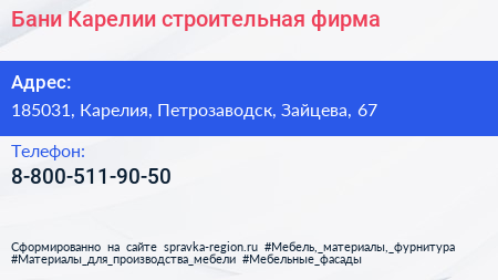 Бани Карелии, строительная фирма по адресу 185031, Карелия, Петрозаводск, Зайцева, 67 в дальнейшем Организация, размещена в следующих категориях: