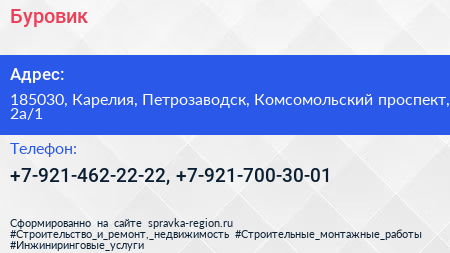 Буровик по адресу 185030, Карелия, Петрозаводск, Комсомольский проспект, 2а/1 в дальнейшем Организация, размещена в следующих категориях: