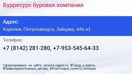 Бурресурс, буровая компания по адресу Карелия, Петрозаводск, Зайцева, 64а к1 в дальнейшем Организация, размещена в следующих категориях: