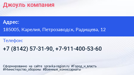 Джоуль, компания по адресу 185005, Карелия, Петрозаводск, Радищева, 12 в дальнейшем Организация, размещена в следующих категориях: