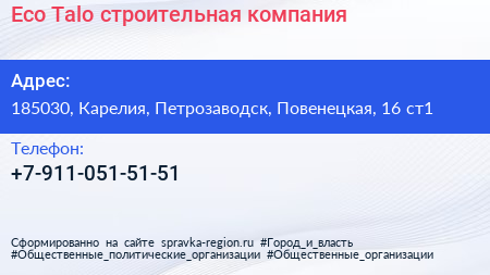 Eco Talo, строительная компания по адресу 185030, Карелия, Петрозаводск, Повенецкая, 16 ст1 в дальнейшем Организация, размещена в следующих категориях: