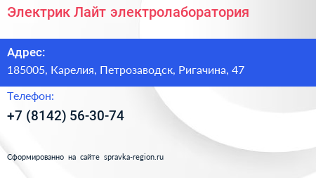 Электрик-Лайт, электролаборатория по адресу 185005, Карелия, Петрозаводск, Ригачина, 47 в дальнейшем Организация, размещена в следующих категориях: