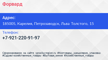 Форвард по адресу 185005, Карелия, Петрозаводск, Льва Толстого, 15 в дальнейшем Организация, размещена в следующих категориях: