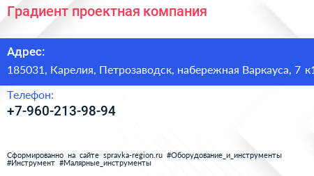Градиент, проектная компания по адресу 185031, Карелия, Петрозаводск, набережная Варкауса, 7 к1 в дальнейшем Организация, размещена в следующих категориях: