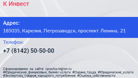 К-Инвест по адресу 185035, Карелия, Петрозаводск, проспект Ленина, 21 в дальнейшем Организация, размещена в следующих категориях: