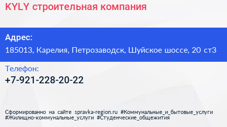 KYLY, строительная компания по адресу 185013, Карелия, Петрозаводск, Шуйское шоссе, 20 ст3 в дальнейшем Организация, размещена в следующих категориях: