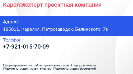 КарелЭксперт, проектная компания по адресу 185011, Карелия, Петрозаводск, Белинского, 7в в дальнейшем Организация, размещена в следующих категориях: