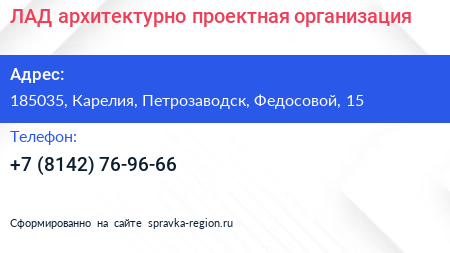 ЛАД, архитектурно-проектная организация по адресу 185035, Карелия, Петрозаводск, Федосовой, 15 в дальнейшем Организация, размещена в следующих категориях:
