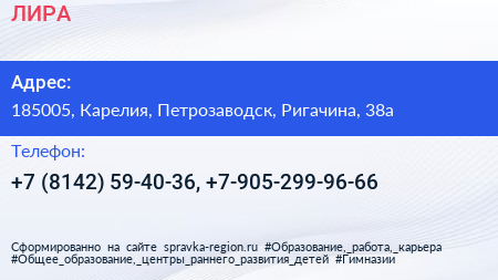 ЛИРА по адресу 185005, Карелия, Петрозаводск, Ригачина, 38а в дальнейшем Организация, размещена в следующих категориях: