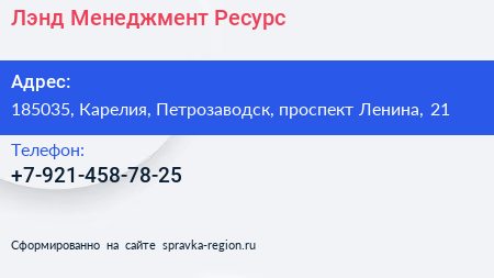 Лэнд Менеджмент Ресурс по адресу 185035, Карелия, Петрозаводск, проспект Ленина, 21 в дальнейшем Организация, размещена в следующих категориях: