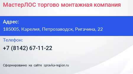 МастерЛОС, торгово-монтажная компания по адресу 185005, Карелия, Петрозаводск, Ригачина, 22 в дальнейшем Организация, размещена в следующих категориях: