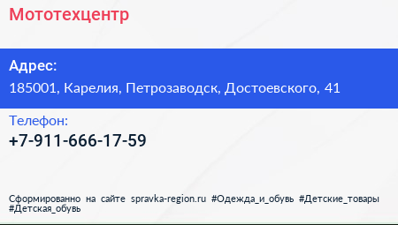 Мототехцентр по адресу 185001, Карелия, Петрозаводск, Достоевского, 41 в дальнейшем Организация, размещена в следующих категориях: