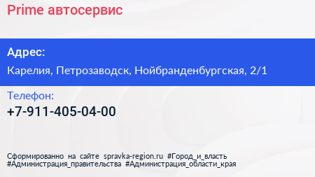 Prime, автосервис по адресу Карелия, Петрозаводск, Нойбранденбургская, 2/1 в дальнейшем Организация, размещена в следующих категориях:
