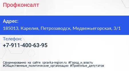 Профконсалт по адресу 185013, Карелия, Петрозаводск, Медвежьегорская, 3/1 в дальнейшем Организация, размещена в следующих категориях: