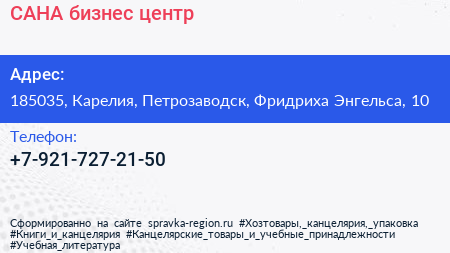 САНА, бизнес-центр по адресу 185035, Карелия, Петрозаводск, Фридриха Энгельса, 10 в дальнейшем Организация, размещена в следующих категориях: