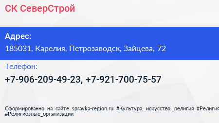 СК СеверСтрой по адресу 185031, Карелия, Петрозаводск, Зайцева, 72 в дальнейшем Организация, размещена в следующих категориях: