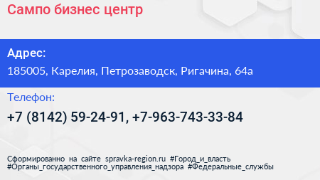 Сампо, бизнес-центр по адресу 185005, Карелия, Петрозаводск, Ригачина, 64а в дальнейшем Организация, размещена в следующих категориях: