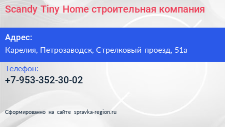 Scandy Tiny Home, строительная компания по адресу Карелия, Петрозаводск, Стрелковый проезд, 51а в дальнейшем Организация, размещена в следующих категориях:
