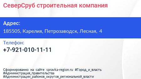 СеверСруб, строительная компания по адресу 185505, Карелия, Петрозаводск, Лесная, 4 в дальнейшем Организация, размещена в следующих категориях: