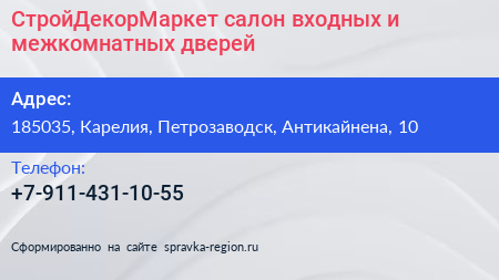 СтройДекорМаркет, салон входных и межкомнатных дверей по адресу 185035, Карелия, Петрозаводск, Антикайнена, 10 в дальнейшем Организация, размещена в следующих категориях: