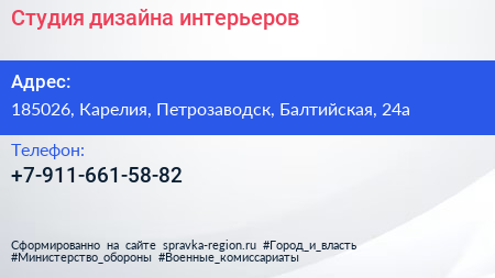 Студия дизайна интерьеров по адресу 185026, Карелия, Петрозаводск, Балтийская, 24а в дальнейшем Организация, размещена в следующих категориях: