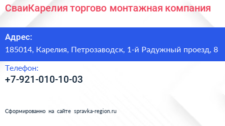 СваиКарелия, торгово-монтажная компания по адресу 185014, Карелия, Петрозаводск, 1-й Радужный проезд, 8 в дальнейшем Организация, размещена в следующих категориях:
