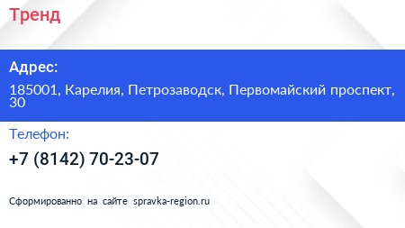 Тренд по адресу 185001, Карелия, Петрозаводск, Первомайский проспект, 30 в дальнейшем Организация, размещена в следующих категориях: