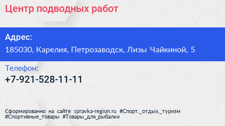 Центр подводных работ по адресу 185030, Карелия, Петрозаводск, Лизы Чайкиной, 5 в дальнейшем Организация, размещена в следующих категориях: