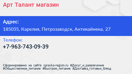 Арт-Талант, магазин по адресу 185035, Карелия, Петрозаводск, Антикайнена, 27 в дальнейшем Организация, размещена в следующих категориях: