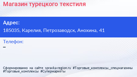 Магазин турецкого текстиля по адресу 185035, Карелия, Петрозаводск, Анохина, 41 в дальнейшем Организация, размещена в следующих категориях: