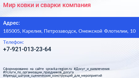 Мир ковки и сварки, компания по адресу 185005, Карелия, Петрозаводск, Онежской Флотилии, 10 в дальнейшем Организация, размещена в следующих категориях:
