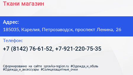 Ткани, магазин по адресу 185035, Карелия, Петрозаводск, проспект Ленина, 26 в дальнейшем Организация, размещена в следующих категориях: