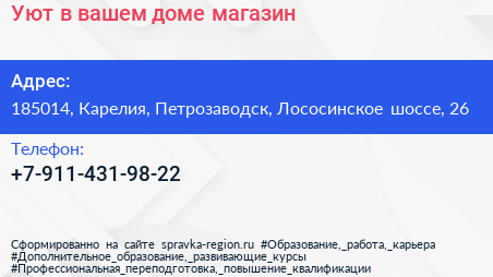 Уют в вашем доме, магазин по адресу 185014, Карелия, Петрозаводск, Лососинское шоссе, 26 в дальнейшем Организация, размещена в следующих категориях: