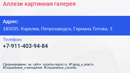 Аллези, картинная галерея по адресу 185035, Карелия, Петрозаводск, Германа Титова, 5 в дальнейшем Организация, размещена в следующих категориях: