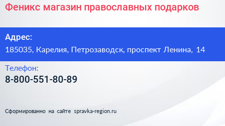 Феникс, магазин православных подарков по адресу 185035, Карелия, Петрозаводск, проспект Ленина, 14 в дальнейшем Организация, размещена в следующих категориях:
