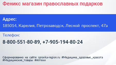 Феникс, магазин православных подарков по адресу 185014, Карелия, Петрозаводск, Лесной проспект, 47а в дальнейшем Организация, размещена в следующих категориях: