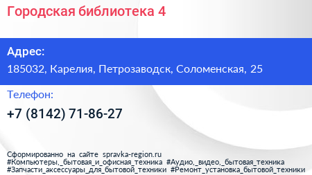 Городская библиотека №4 по адресу 185032, Карелия, Петрозаводск, Соломенская, 25 в дальнейшем Организация, размещена в следующих категориях: