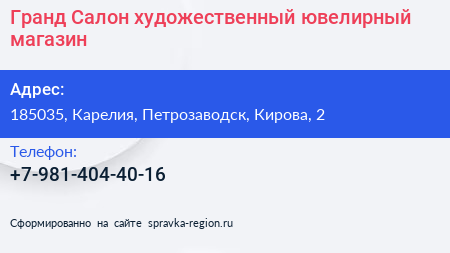 Гранд Салон, художественный ювелирный магазин по адресу 185035, Карелия, Петрозаводск, Кирова, 2 в дальнейшем Организация, размещена в следующих категориях: