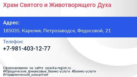 Храм Святого и Животворящего Духа по адресу 185035, Карелия, Петрозаводск, Федосовой, 21 в дальнейшем Организация, размещена в следующих категориях: