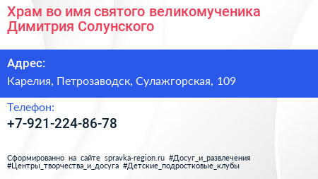 Храм во имя святого великомученика Димитрия Солунского по адресу Карелия, Петрозаводск, Сулажгорская, 109 в дальнейшем Организация, размещена в следующих категориях:
