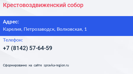 Крестовоздвиженский собор по адресу Карелия, Петрозаводск, Волховская, 1 в дальнейшем Организация, размещена в следующих категориях: