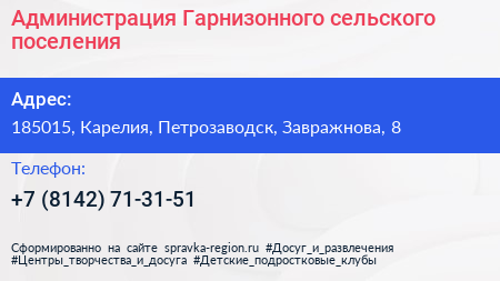Администрация Гарнизонного сельского поселения по адресу 185015, Карелия, Петрозаводск, Завражнова, 8 в дальнейшем Организация, размещена в следующих категориях:
