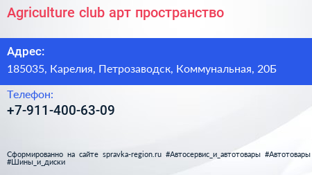 Agriculture-club, арт-пространство по адресу 185035, Карелия, Петрозаводск, Коммунальная, 20Б в дальнейшем Организация, размещена в следующих категориях: