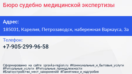 Бюро судебно-медицинской экспертизы по адресу 185031, Карелия, Петрозаводск, набережная Варкауса, 3а в дальнейшем Организация, размещена в следующих категориях:
