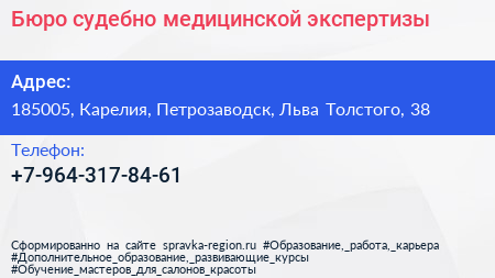 Бюро судебно-медицинской экспертизы по адресу 185005, Карелия, Петрозаводск, Льва Толстого, 38 в дальнейшем Организация, размещена в следующих категориях:
