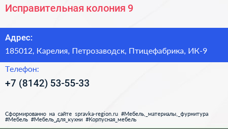 Исправительная колония №9 по адресу 185012, Карелия, Петрозаводск, Птицефабрика, ИК-9 в дальнейшем Организация, размещена в следующих категориях:
