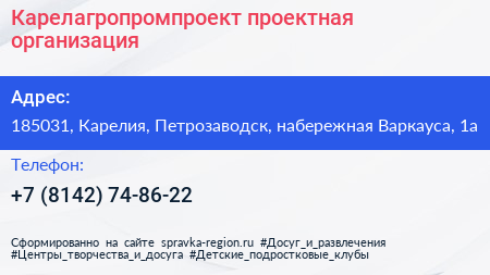 Карелагропромпроект, проектная организация по адресу 185031, Карелия, Петрозаводск, набережная Варкауса, 1а в дальнейшем Организация, размещена в следующих категориях: