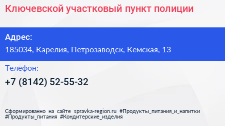 Ключевской, участковый пункт полиции по адресу 185034, Карелия, Петрозаводск, Кемская, 13 в дальнейшем Организация, размещена в следующих категориях: