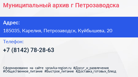 Муниципальный архив г. Петрозаводска по адресу 185035, Карелия, Петрозаводск, Куйбышева, 20 в дальнейшем Организация, размещена в следующих категориях: